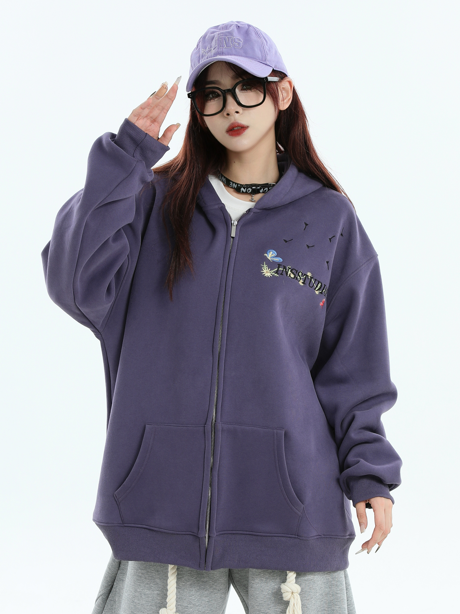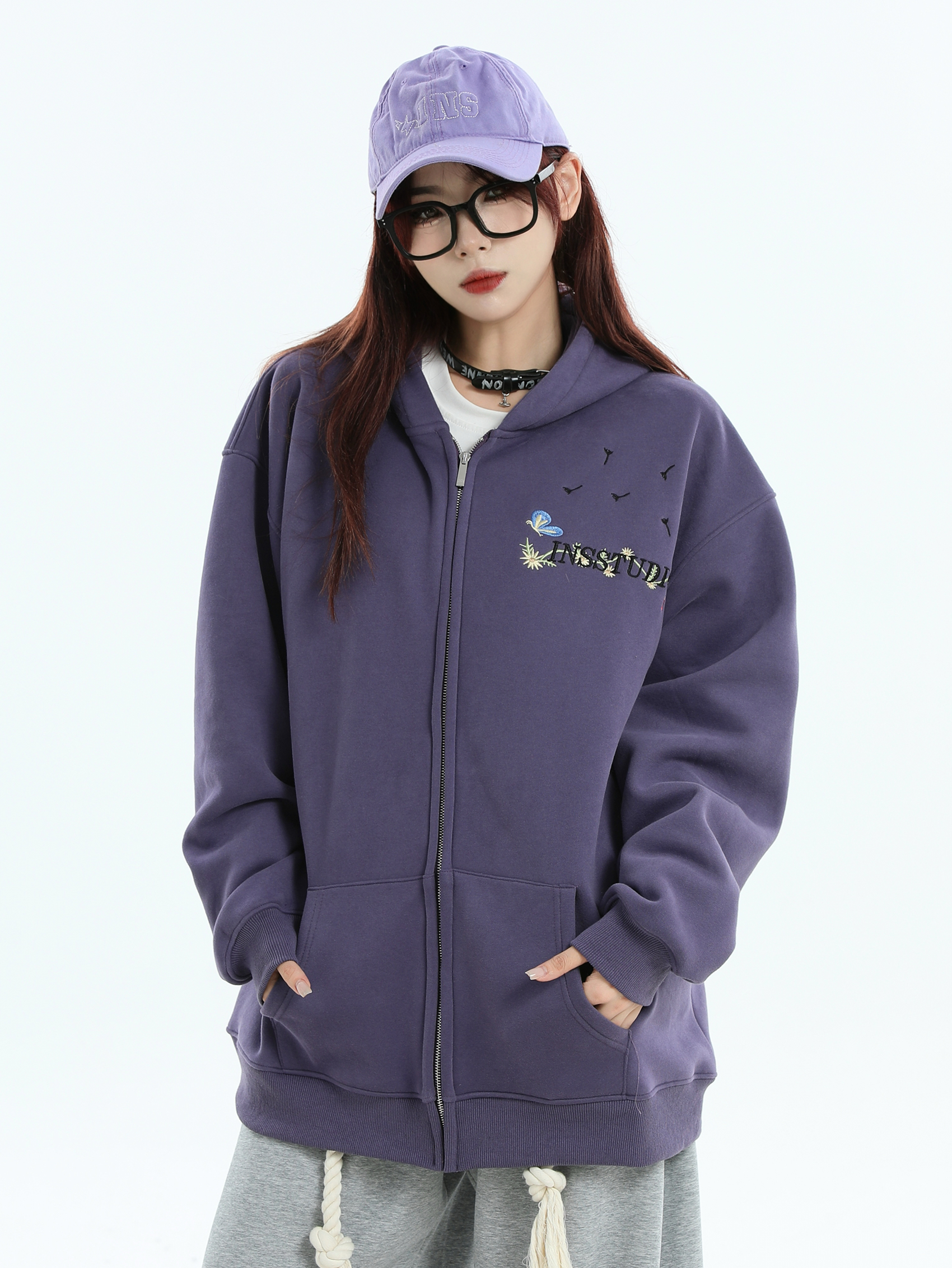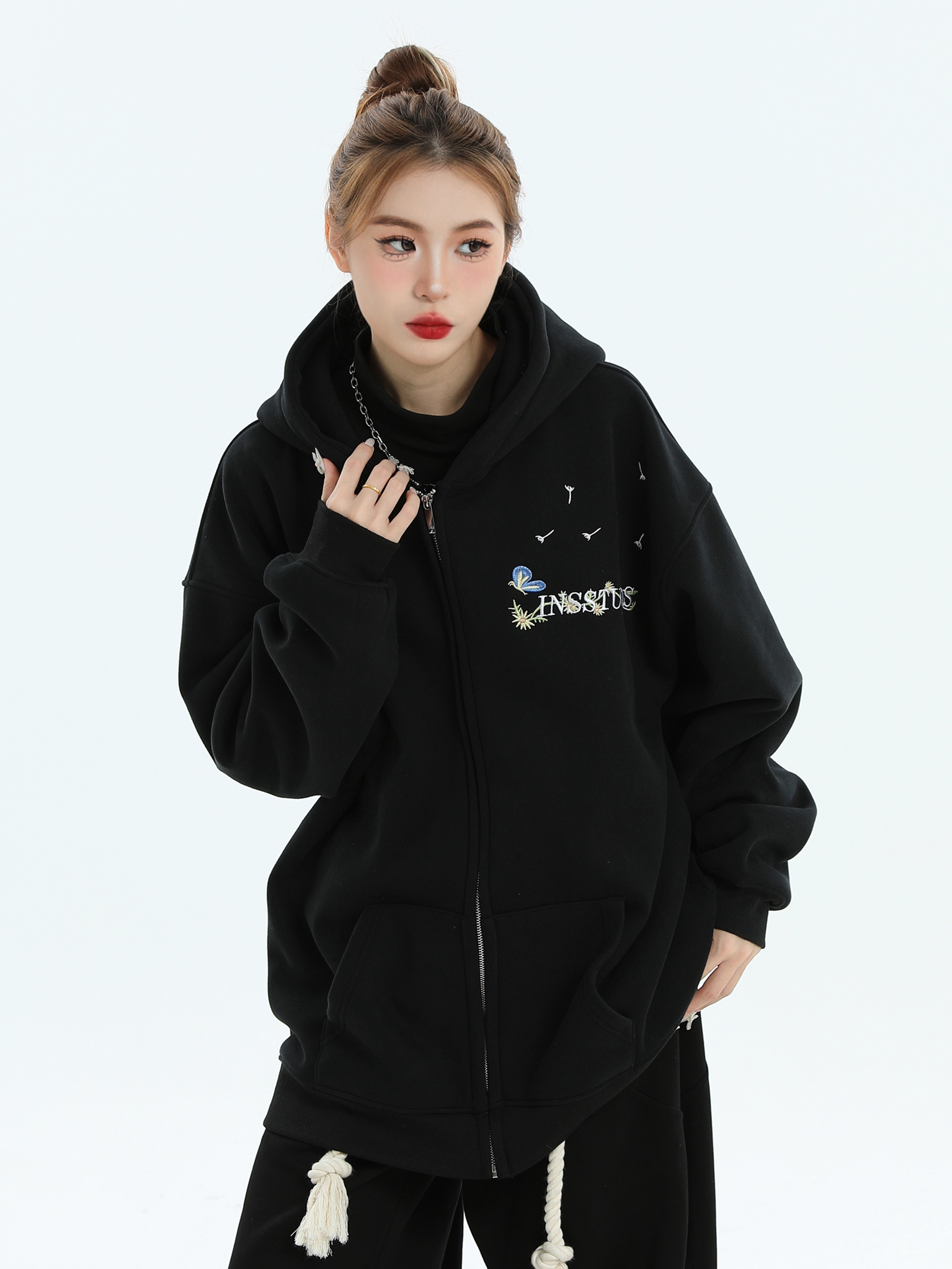 China-Chic Couple American Butterfly LOGO Embroidery Sweater Loose Plush Zipper Coat Men